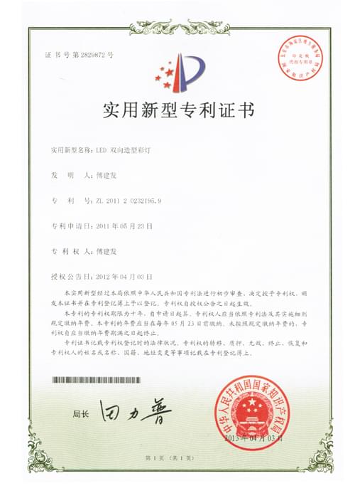 大旗燈飾自主研發(fā)的“LED雙向造型彩燈”,正式獲得“實(shí)用新型專利證書”(專利號(hào):ZL 2011 2 0232195.9)。...