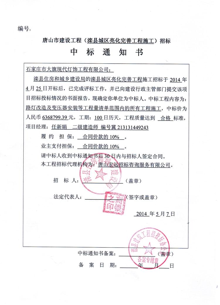 熱烈祝賀石家莊市大旗現(xiàn)代燈飾工程有限公司在“南興隆街、下二道河子、小溪溝路燈安裝工程施工”招標(biāo)中中標(biāo)。...