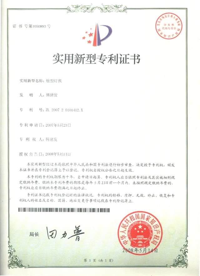 大旗燈飾自主研發(fā)的LED“燭形燈泡”,正式獲得“實用新型專利證書”(專利號:ZL 2007 2 0101412.X)...