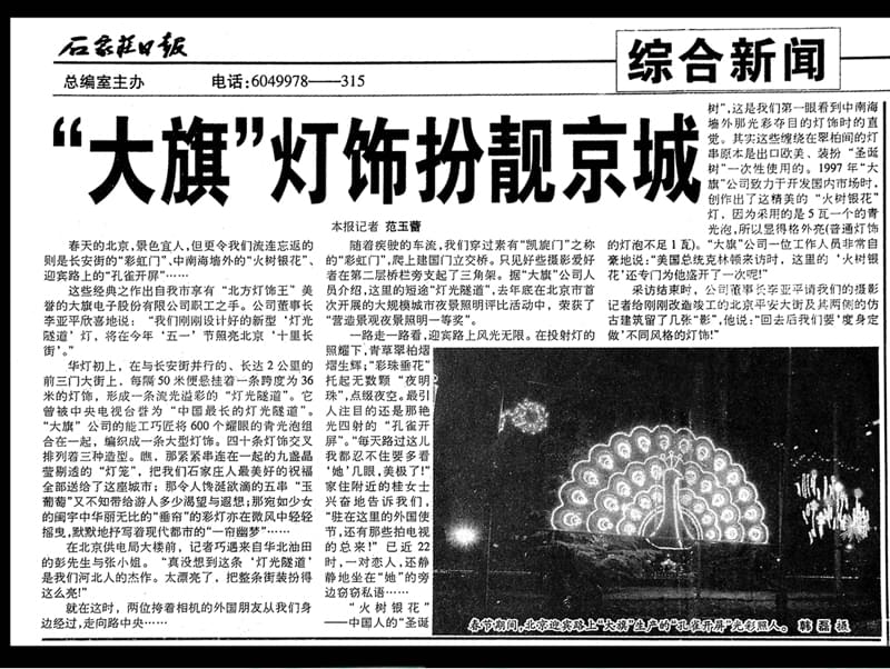 在香港和澳門回歸、建國五十周年、迎新千年等重大喜慶節(jié)日里,將夜幕下的首都北京裝點得流光溢彩、華美壯觀的大型現(xiàn)代燈飾,原來出自我市“大旗”公司的能工巧匠之手。...